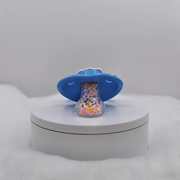 Sanrio themed pacifier. Size 6 teat. Stickers stealed with resin. Some of the rhinstones glow in the dark. Teat is filled with star glitter.