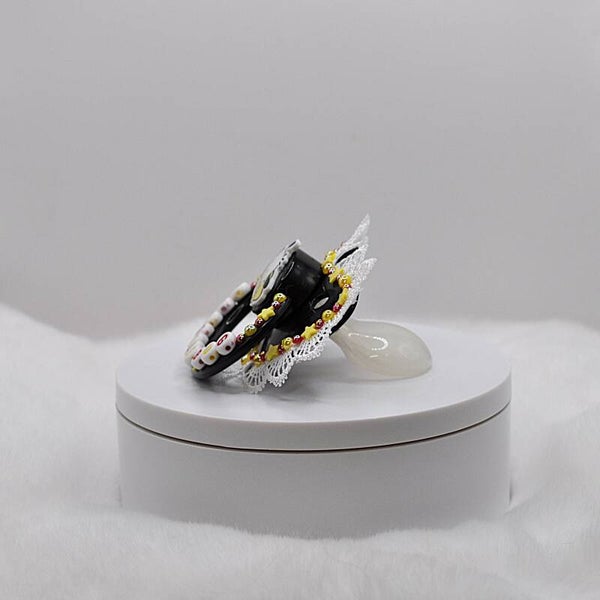 Each pacifier teat is kept in a bag during the decorating process, and my hands and all surfaces are thoughly washed before I touch anything. It is still suggested that you wash each pacifier thoroughly before use.