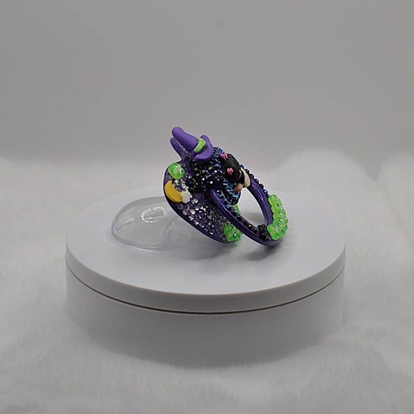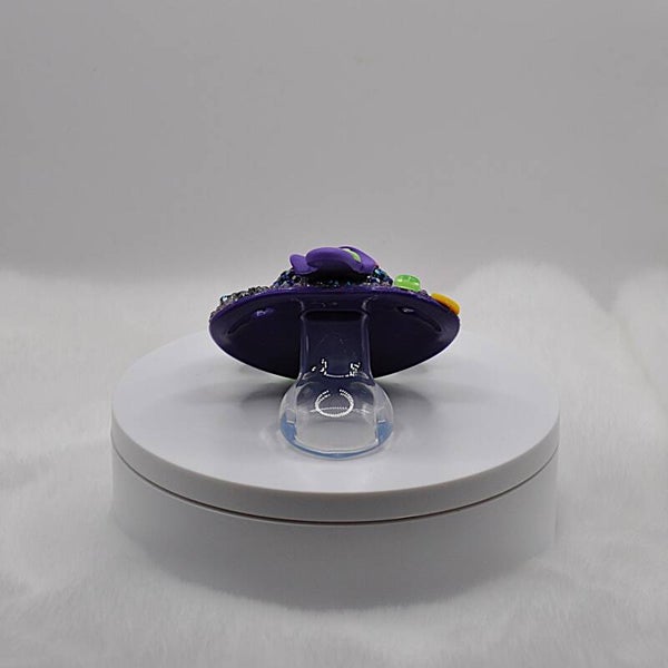 This spooky themed pacifier is perfect for every little witch! All clear rhinestones on the base glow in the dark. Size 6 teat.
